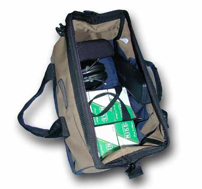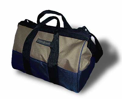 WORK GEARのバッグは、最近国内でも時々見かけるようになった、いかにもアメリカらしい工具バッグです。じつはこれが弾入れにちょうど良い。このシリーズには底が皮製で、把手も皮製の上位製品から、今回紹介する#90-322の廉価版までいろいろな製品がラインナップされています。 さて今回紹介の製品は、皆さん御存じのジョイフル本田で3980円(2002.07.01現在)のお買得価格で販売されています。 みなさんが射撃場にお持ちになる弾ケースは、アルミのカメラケースを薄くしたような物が多いと思います。実は私も同じようなケースを使っていたのですが、ショルダーベルトが無く、またクリーニングキットや、シューティンググラスやイアープロテクター、さらにはベストなどを入れるスペースが無く、結局銃ケースを入れると3個のケースを下げて行くことになり、困っていました。 | |