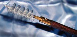 さて、今回はまあふつうのボア・クリーニングキットなんですが、なんて言うかやっぱりこの木のロッドが好きなんですね私は。 今まで使っていた4段繋ぎのアルミのクリーニングロッドでは、問題が2つありました。 第1の問題点は真鍮ブラシを通している時に、必ずつなぎ部分のネジが緩んでくることで、かなりきつめに締めておかないと、何回か通しているとがたがたに緩んでくるのが問題でした。ところがこのロッドでは、3段繋ぎのロッド径が太いだけに、締めやすく弛みにくいのでそのようなことも無くなりました。 第2の問題点はふつうの真鍮ブラシでクリーニングすると、こすって出たカスがムラになって銃身内に残ったので、そのあとでウールブラシで奇麗に拭き取り、ウェスを通していました。 ところがこのキットに付属のコイルブラシ(写真を参照)を使うと、結構奇麗に銃身のカスを取ってくれるうえに、そのブラシの掃除も簡単なのには驚きました。なお木部は購入時は白木でしたが、オイルステインで着色後にアンティーク・ワックスで仕上げしてあります、ねんのため! | |