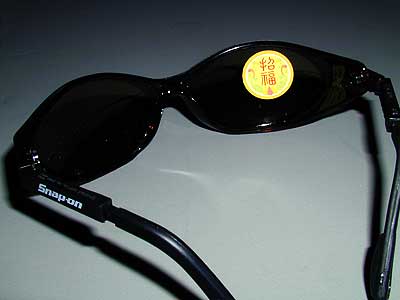 | こんな感じになってます、見よこの「招福」の文字を!! まあ簡単に言えば、裏から丸いシールを貼っただけなんですけど、この方法は結構昔からやってる方法で、シールの直径を変えることで遮蔽する範囲を、コントロールすることが出来ます。本当は直径が1cmぐらいに切ったメンディングテープや黒いテープを貼ったほうが気にならないのですが、受けをねらって100円ショップで買った招福シールを貼ってみました。(笑) 貼り方のコツは、レンズの中心に貼るのではなく、実際の射撃姿勢の状態で、照星を遮蔽する位置(上ぎみの幾分外側)に貼ります。 まあ使ってみると、ちょっと径が大きかったかな?と思うのと、黄色いので裏からの反射があるのが気になるのですが、仲間には確かにうけましたね。 今後はマトモに黒いシールか、半透明のシールをはって真面目仕様にして使用するつもりです。こういった物としては、ブローニングの商品でマジックドットというものもあります。これも裏から貼るシールですが、グラスの色に合わせた赤やアンバーなどの色の半透明にしてあるところが工夫です。 必要な方はマトモ仕様でおためし下さい。片目をつぶるより周辺視野が広がり、緊張も少なくなります。 なお写真のグラスは薄めのアンバーカラーのSnap-onのセーフティグラスで、UBEXのOEM品ですが、2300円でした。 | ||||||