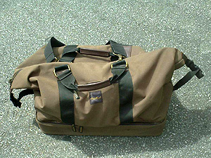 ![]() | 今回のグッズは、ごらんの通りのバッグです。私は普段は以前にこの欄で紹介したトールバッグにいろいろと入れて射撃場に行ってますが、荷物の多い時と、弾を多く持って行く時などは、このバッグを使っています。 この形式のバックはエディバウワーに限らず、各社から発売されていますが、ワックスドコットンを使用した落ち着いた外観に惹かれて購入いたしました。といっても実際には、一昨年、横浜のベイサイドマリーナのアウトレットで、女友達(彼女じゃないよ)にボランティア仕事のお礼に買ってもらった物です。価格はなんと4800円(定価はたしか12800円)でした。普段はバイクでのお出かけに使ってますが、1泊旅行にも便利に使っています。 | ||||||