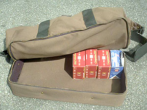 | 射場に行くとこのタイプのベレッタのバッグを持って来て、射撃用バッグだって自慢する人がいますが、物を知らなすぎます。もともとこのタイプのバッグが旅行用、スポーツ用として非常にポピュラーな形式のバッグです。スポーツ用としては、シューズやぬれた水着など、別に入れておきたいものが有るのが普通なので、大変重宝する形式です。旅行用としては、スーツやシャツなど、しわになっては困るものや靴などを分けていれる場合にやはり大変重宝する形式です。まあどれでもレンジバッグとして使えますが、気をつけなければいけないのが、底の部屋をつなぐジッパーの強度です。 国産のスポーツバッグなどにはこの部分のジッパーに歯の小さいものを使っている場合がほとんどで、弾を250も入れるには強度不足の物が結構ありますから、購入時に良く確かめて下さい。 | ![]() | ||||||
