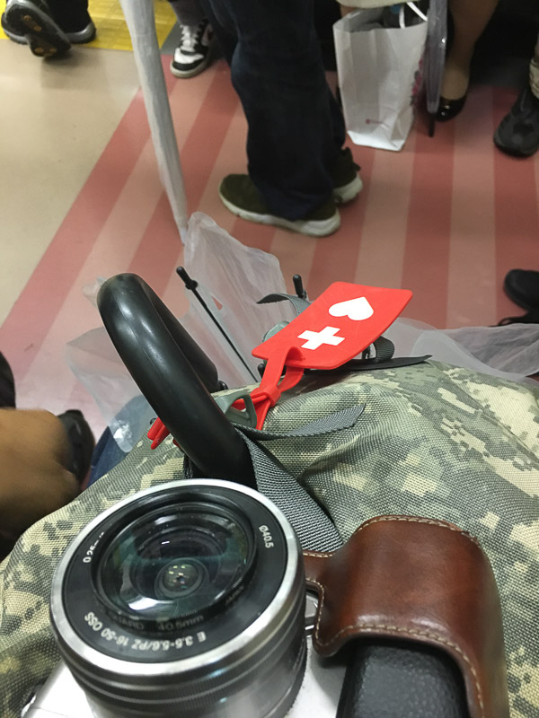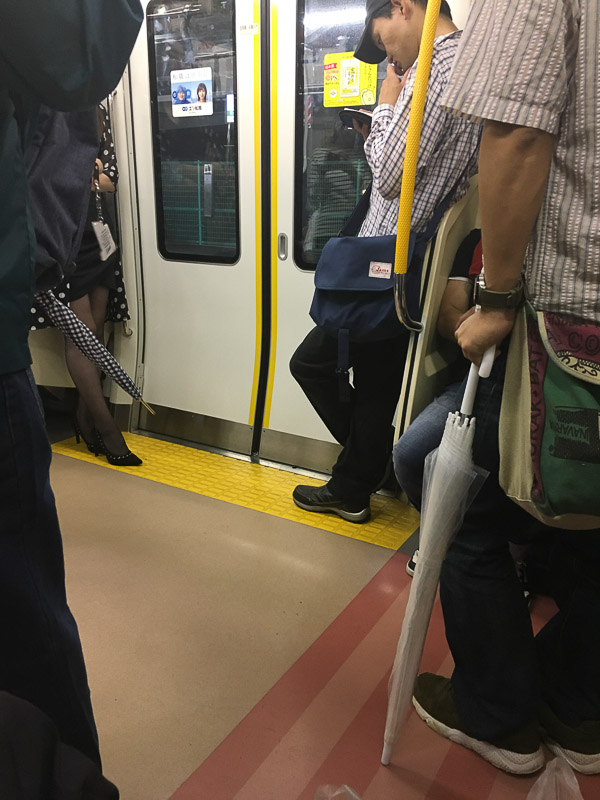 帰りの電車。さすがに座れません。