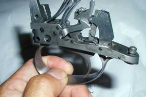 トリガー機構が外せる機種では、トリガーをはずし、部品の状態を目視確認後、軽くオイルを吹き付けておく。またレシーバー内部ではロッキングレバーのリンク部分にあるリターンスプリングや、撃針部分をチェックしておく。この部分の潤滑はスプリングなどに少量のオイルを直接触れずに給油しておく。なお各スプリングに変色や錆がわずかでも出ているようなら、いずれそこから折れてしまうので、思いきって交換に出しましょう。