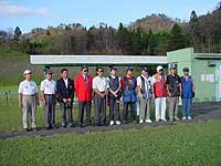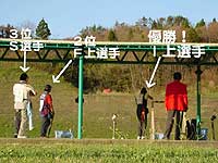さて,しばらくの休憩時間(ゼッケン作ったりしてるのね)の後,いよいよ平成16年度のダブルトラップ日本一を決めるファイナルが始まります。主審の方もファイナルでは真っ赤な上着を着ての登場となります。還暦のお祝いではありません。出場されるおとうにとっては神様のような選手の方々を改めて紹介しましょう! 予選1位125点・神奈川県I上選手,2位113点・京都府F上選手,3位106点・神奈川県S選手,4位101点・神奈川県T岡選手,5位99点・福岡県O上選手,6位89点・広島県K林選手。なんかこうやって書くと,神奈川県に引っ越して名前に「上」の字を付けるとダブルトラップがうまくなるのかなぁ〜とか考えちゃいますね!(そんなヤツはいない)あっ,おとうは名前に「上」どころか正反対の「下」が付いてました・・・どうりでへたくそなわけだ・・・でもね,こういう出場者紹介を見ているとフツフツと闘志がわいてきますね!いつかはこの舞台に立ってやるぞ〜!もともと出場しただけでも無謀と言える全日本チャレンジですが,こういう場を見せつけられるとやはり気持ちは燃えてきます! さあ,ファイナルが始まります!本当のトップレベルの争いと言っていいでしょう!ダブルトラップファン必見の大一番です!ファイナルの射順は6位→1位の順となります。これを間違えるバカなヤツが以前二本松に参戦していましたね・・・さて,ファイナルですからパウダークレーが飛び散ります!ダブルトラップだと普通の二倍粉が舞うわけですからとってもカラフルですよね!息を呑むファイナルも出だしは皆さん一進一退,デッドヒートを繰り広げます。  しかし中盤からはやはり大舞台に慣れたI上選手が頭一つリードしてきます。まんべんなく40以上を稼げる点数運びは他の選手と一線を画しているようですね。ついにファイナルも終了!終わってみればI上選手の圧勝です!拍手拍手拍手!パチパチパチ!最終成績は優勝I上選手167点,2位F上選手145点,3位S選手137点という見事なスコアの数々!憧れるばかりです。おとうも3ラウンドで100点を超えるスコアをいつかは出したいものです。当然ですが,全日本選手権優勝の方は大きな優勝カップを抱えた御姿を写真に撮り,射撃場に飾られるわけですね!まあ,おとうが飾られることは一生ないと思いますが,憧れだけは常に持っております。万が一優勝することを考えて今から写真うつりが良いようにプチ整形でもしておこうかな?(いらん心配です!キッパリ!) しかし,全日本選手権ダブルトラップファイナルに残った神様達の中で,I上選手はダブルトラップの直前まで試合をしていた全日本トラップ女子でも4位,K林選手も同じく午前中に開催されていた全日本シニアトラップで2位!上手な方は何をやらせてもお上手ですよね〜〜。はっ,逆に何をやらせてもへたくその人も存在してしまうのではないだろうか・・・(自分) さて,おとうにとっての平成16年度全日本選手権はこれで幕を閉じます。もちろん大方のシューターにとってのメインイベントである全日本選手権トラップとスキートは翌日以降に熱戦が繰り広げられるはずです!(がんばれ〜,Moon!負けるな〜,JM!)今回の大暴挙とも言える全日本参戦をおとうなりに振り返ってみます。前回の本部公式は参加者も少なく,ある意味運だけで入賞を果たしてしまったため,正直浮き足立ってしまった点もあったかと思います。11位という結果に自分の現在の位置づけがしっかりとでき,改めて足下をシッカリと踏みしめてこれからに望めそうです。スコア的な目標(当面各セット30枚以上を確実に!),順位的な目標(常にファイナルを目指したい!)を自分で持つことができ,漠然とやりたいという気持ちから,確固たる目標を目指す意志が芽生えてきた気がします。何より全日本選手権を終え,ますますダブルトラップを続けていこうという意志が力強くなったことを感じました。やりたい,やっていこうという気持ちがもの凄くわいてきたのです!向上心をより強いものにできた!これが今回の全日本選手権でおとうが勝ち得た価値ある賞品であったと思います!(だから勝ってないって・・・) おまけ:ぶらり秋田日帰りの旅 さて,若干誌面が余った(どの誌面のことだ?)ようですので,早起きした時間つぶしにちょっとだけ海岸線をドライブした風景を紹介しましょう。岩城町を国道7号線沿いに北上するとそのまま秋田市内に入れます。国道沿いには防風林と思わしき木々が並びますが,この木が全て陸側に傾いております。おそらくは冬場の海風が大変強く,風を防ぐ木も斜めに傾いてしまうほどのものなのでしょう。秋田に行った日はお天気良好!風もほとんどなし!という絶好の観光イヤ射撃日和だったのですが,これほどまでに木を傾けるほどの風が吹いていたら果たしてまともにクレーが飛ぶのだろうかと不安に思ってしまうほどです。秋田市の海岸沿いには工業地帯のようなところがあるのですが,この端に風量発電の大きな風車が連なるポイントがあります。  アメリカ大陸の○○○○州(どこだか知らない・・
